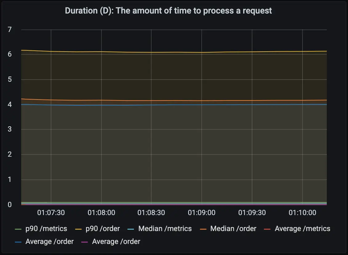 Figure 3 shows the time it took to process a request. Displayed here are the 90th percentile, the median, and the average durations for different endpoints of the Node.js app. The 90th percentile is the slowest 10% of requests. For the 10,000 requests we sent with ApacheBench, this means the 1,000 requests that took the longest time. In this case, it shows that 1,000 requests to the /order endpoint took over 6 seconds.