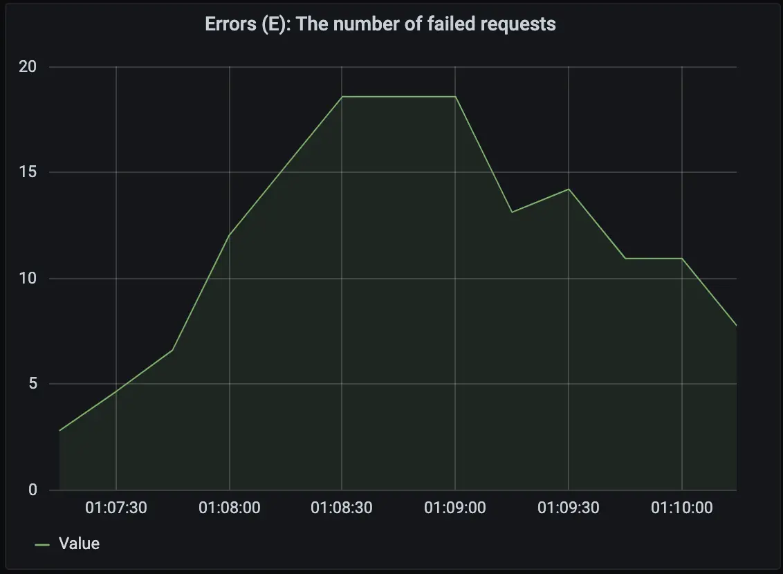 After running the ab command, you can access the Grafana dashboard via http://localhost:3000/d/1DYaynomMk/example-service-dashboard.