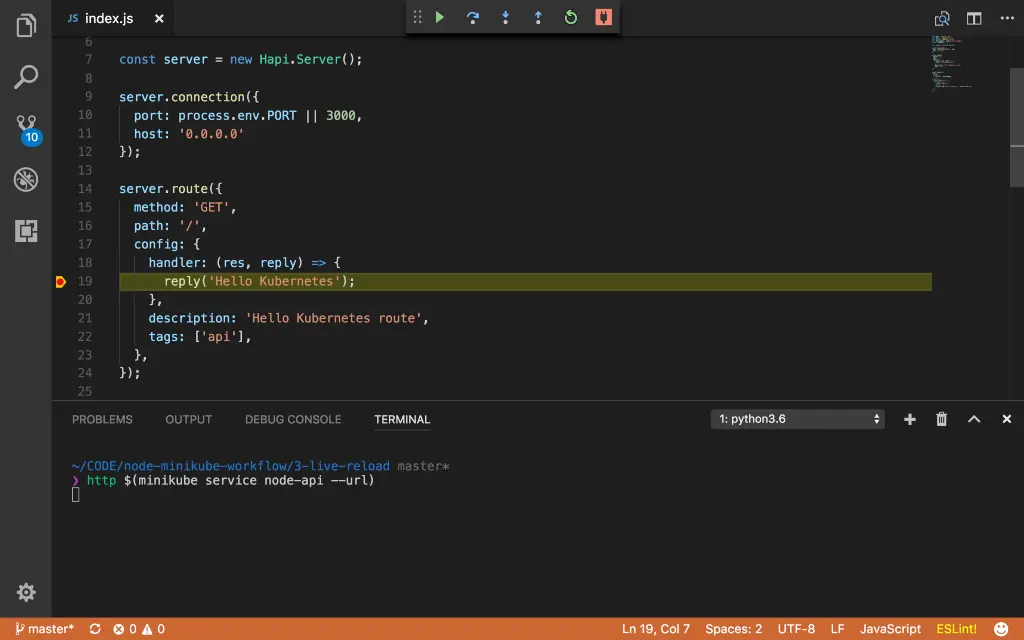 Press F5 to start the debugger in Visual Studio Code and run minikube service node-api --url to retrieve the exposed URLs of the Kubernetes service: